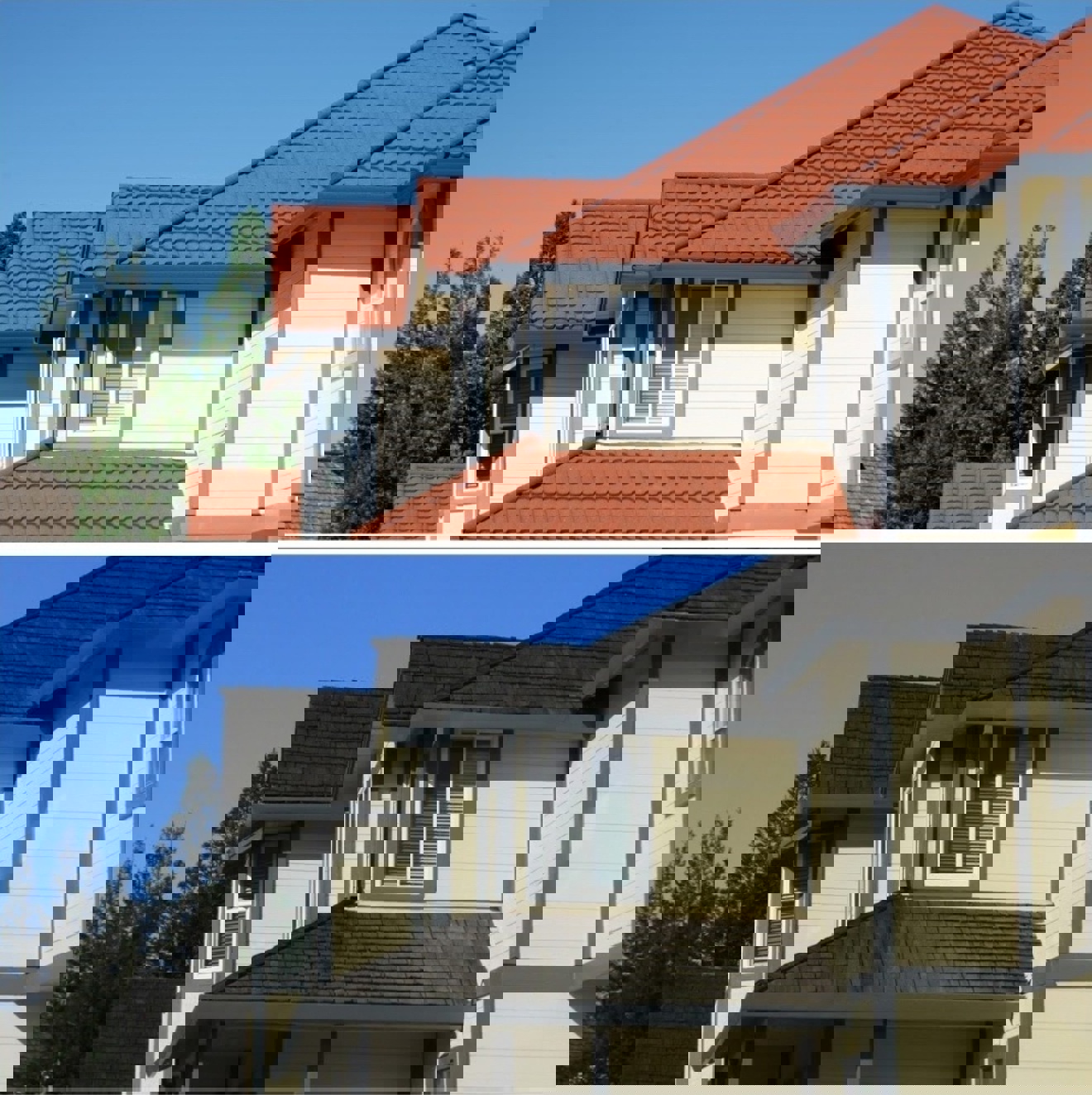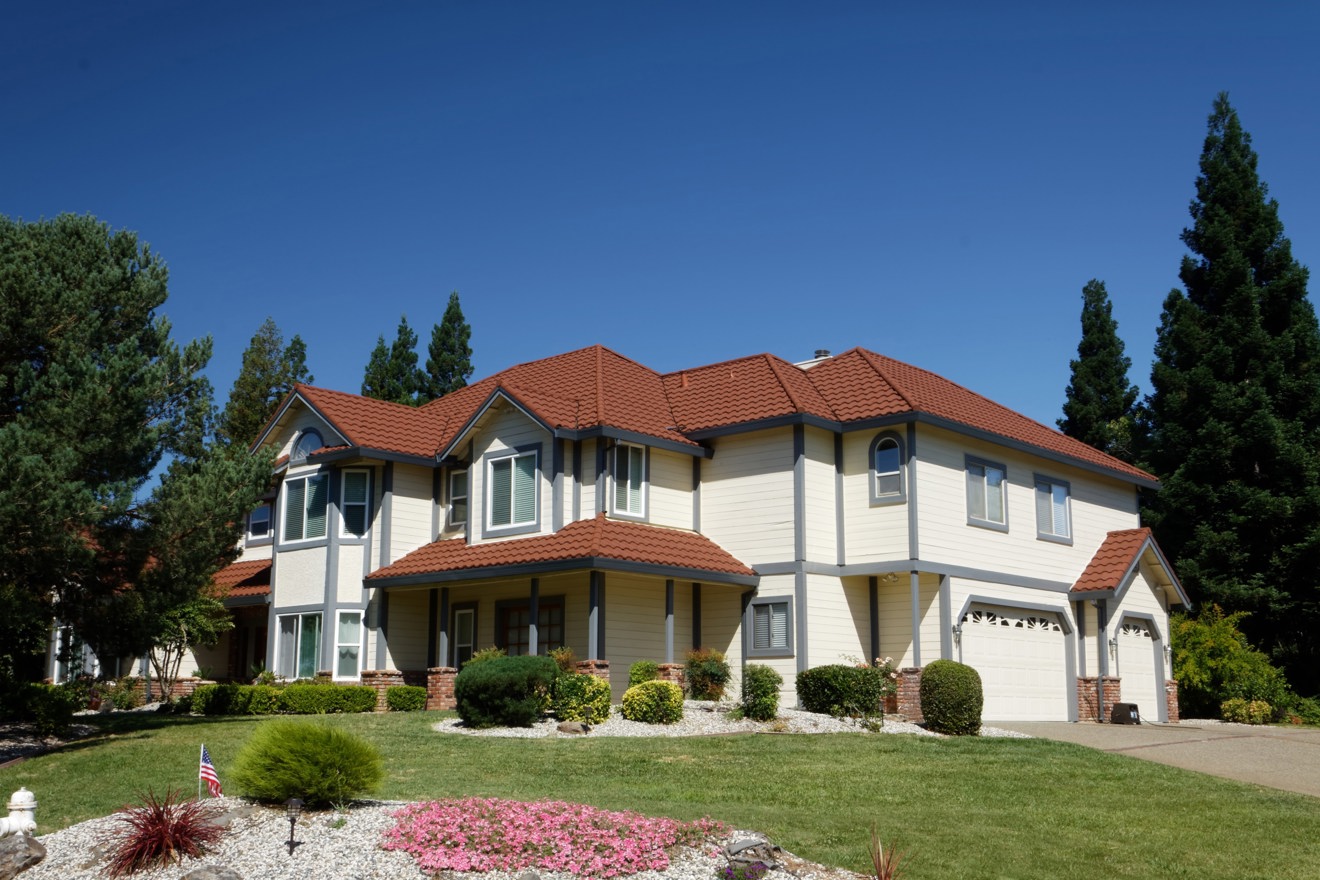 The Roseville re-roof (above) shows the striking Mediterranean look of Tilcor’s stone-coated pressed metal panels (bottom) in comparison with the old wood shake (top). The Tilcor Antica finish offers the strength and graceful feature of the Mediterranean panel, its S-tile shape creates superior durability for a lifetime of elegance.